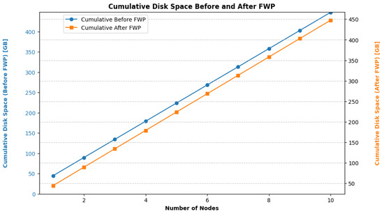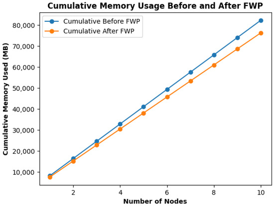 Figure 8. Cumulative memory usage before and after FWP. - FWP effect on cumulative disk space with node expansion.This experiment investigates the effects of FWP on cumulative disk space usage across an expanding node federation.Figure 9 provides a visual representation of cumulative disk space usage across ten nodes, both before and after the implementation of FWP. The cumulative disk space usage is presented in gigabytes (GB) and is measured as the sum of disk space occupied by each node in the federation. The blue line represents the cumulative disk space consumption before FWP, showcasing the gradual increase in storage usage as more nodes are incorporated into the network. Each point on the line corresponds to a specific node, illustrating the progressive accumulation of data storage requirements across the network. In contrast, the orange line represents cumulative disk space usage after FWP activation. There is a similar growth trend as more nodes join the network. The graph utilizes a dual-axis approach, with separate y-axes on the left and right sides, to present cumulative disk space usage before and after the implementation of FWP. This separation prevents data from overlapping with the other, ensuring that both trends can be easily examined and compared.