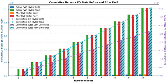 Figure 10. Cumulative network I/O Stats before and after FWP.The graph demonstrates a notable network traffic pattern. Initially, there is a reduction in data bytes sent and received at Node 1 after implementing FWP. However, as more nodes join the federation, there is a consistent increase in network activity. Notably, the cumulative difference bars (purple and cyan) remain positive, highlighting FWP’s ability to effectively manage and optimize data traffic as the network scales. This trend suggests significant network traffic savings when FWP is employed with a larger number of nodes, enhancing network efficiency and resource utilization.