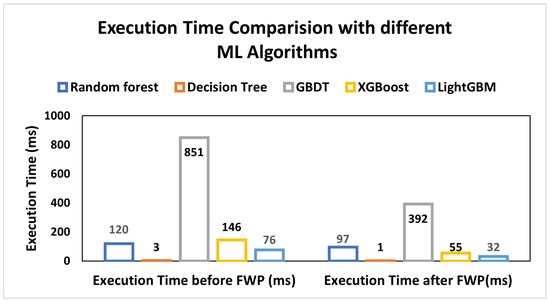 - Faster convergence of ML algorithms.When compared with the conventional approaches, the execution time of each of the five different machine learning algorithms evaluated with the proposed FWP was found to be significantly reduced, as shown in Figure 11. According to the results, Decision Tree and Random Forest performed better than other ML algorithms and converged more quickly. Even though the worst-performing model with the longest execution time was GBDT, our proposed model, FWP, cut the execution time to almost half.