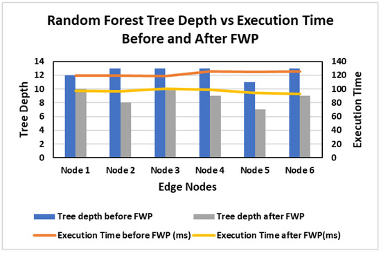Figure 11. Execution time before and after FWP. - Memory utilizationAlgorithms for machine learning, such as Random Forest, have memory requirements that vary with the number and size of the trees in the algorithm. When dealing with big or complex datasets, the tree might be quite deep and include thousands of nodes. In such circumstances, the memory usage will increase exponentially. A decrease in the depth of the tree will lead to a reduction in the amount of memory that is used.In Figure 12, the graph provides us with a visual representation of how the Random Forest Tree Depth affected execution time when FWP is utilized. It is evident that this was the reason for the decreased utilization of resources following FDP implementation.