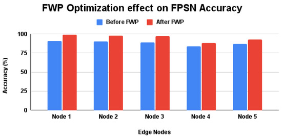 Finally, in Scenario 5, we utilized FWP to aid in edge node selection and FPSN accuracy calculation. We removed an underperforming edge node and only selected trustworthy nodes to use in our FPSN calculation. On an average, applying FWP led to a 6.8% increase in accuracy across all nodes. However, it is worth noting that the degree of improvement varied across different nodes, with Node 1 having the largest increase in accuracy (8%), and Node 4 having the smallest increase (4%).
