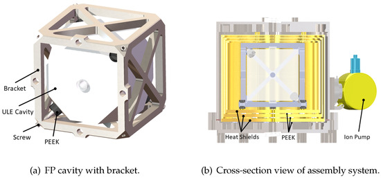There have been numerous studies conducted on laser systems, including nonlinear optical materials [19,20] and the design of optical cavities with different shapes [21,22,23,24]. A cubic FP cavity has the advantage of being force-insensitive, making it appropriate for space missions [25]. Based on this idea, follow-up studies have developed several ground-transportable USLs [26]. A typical USL system based on a cubic FP cavity is shown in Figure 1 [27]. An FP cavity made of ultra-low-expansion (ULE) glass is attached to a titanium bracket by four titanium screws, which support the truncated vertices symmetrically. Gaskets made of PEEK are placed between the screws and the spacer for heat and vibration insulation. In the center of the top and bottom surfaces, two mirrors (one planar and one concave) are optically attached. Subsequently, the bracket is affixed to the inner heat shield. Three heat shields employed in all, as depicted in Figure 1b, between which PEEK gaskets are inserted to prevent heat transfer. Finally, the heat shields are secured to the vacuum chamber using titanium screws. The ion and getter pumps maintain a high vacuum level below Pa.