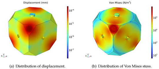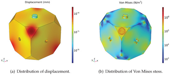 Taking into account the thermal effect of the laser beam in optical and thermal coupling, the magnitude of the beam power in Equation (3) was set to Watt. In thermal and mechanical coupling, the heat radiation to the environment (default 20 °C) and heat conductivity were taken into consideration. In addition, the temperature fluctuation of the vacuum chamber was assumed as Kelvin. Then, the finite element model was assigned materials, meshed, and imposed constraints in a solid mechanical analysis. A fixed force of 200 N was applied to each of the four truncated symmetrical vertices. Finally, a virtual prototyping multi-physics coupling model was established and the results were calculated by FEM.