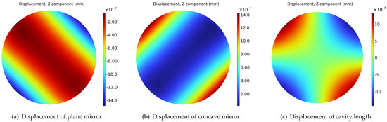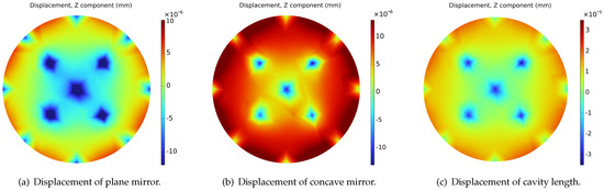 Figure 7 shows the displacement and Von Mises stress distribution under the frequency of 100 Hz, where the color map is logarithmically scaled. Interestingly, the variation of the distribution is non-uniform, i.e., there are local maxima in addition to the four supporting areas, especially on the mirror surface. The Z component displacement of the plane mirror, the concave mirror, and the cavity length change are shown in Figure 8. It can be observed that the cavity length displacement has local maxima and minima around the circumference at 2.5 mm and 5 mm radii. Similarly, two stripe regions of data in Figure 8c with a width of 2 mm along the 45° and −45° were extracted separately and converted to a one-dimensional signal.