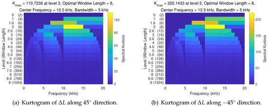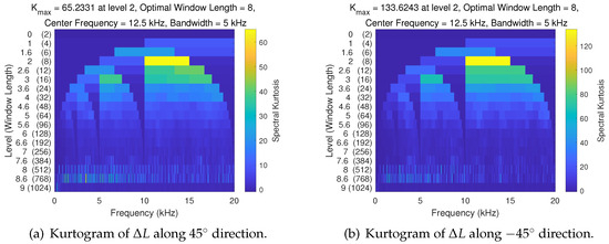 The kurtogram of the cavity length change data along the and directions during the vibration test are respectively computed and visualized in Figure 10. It can be seen that there is a higher maximum K value in the −45° direction compared to the 45° direction, with both directions exhibiting low levels at , indicating that transient fluctuations of the signal have little influence, even if it appears highly nonstationary.