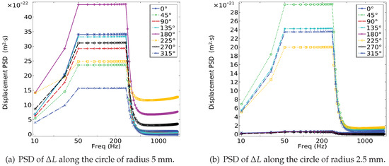 The displacement power spectrum densities of the cavity length change responses at different points along the circle of radius 5 mm and 2.5 mm are shown in Figure 6. Various PSD responses along the logarithmic frequency curves at eight points every 45° around the circumference are presented, which first increase, then remain constant, and finally decrease as the test progresses. The PSD value at 180° is the highest, with radius 5 mm, while the lowest value occurs at 315°. By contrast, the PSD values along radius 2.5 mm at 45°, 135°, 225°, and 315° are far more than others (almost zero), which indicates a more complicated distribution under the vibration test. Therefore, the parameter of 100 Hz which corresponds to the maximum PSD value of the FP cavity is chosen for the next analysis.