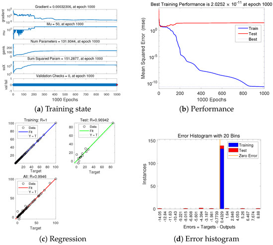 The samples in Table 2 were divided into 90% for training and 10% for testing. The layer size was determined as 40 and Bayesian regulation was adopted as the training algorithm. Figure 12 illustrates the training performance of the neural network model after 1000 epochs. Clearly, the neural network with a very small fitting error () exhibits excellent performance.