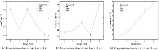 A test set of five points was used for model validation; the comparison results between the NN and surrogate models are shown in Figure 13. While the three models performed quite well overall, the prediction accuracy of all three models decreases for the volume, displacement under fixing force, and displacement under vibration test. This is likely because the volume variation along the design parameters is the most linear among the three indexes, followed by and lastly . As the variation of the index becomes more nonlinear, prediction using the models becomes increasingly challenging.