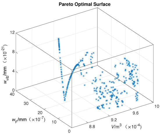The solution set of the Pareto optimal front surface consists of optimal points that are mutually non-dominant, which means that each point in the Pareto optimal front may be the optimal solution. In most engineering cases, practicality and convenience must be taken into account as well. After subtle selection, the final optimal combination of design variables is determined as . The multi-physics model with the optimal parameters was then established and evaluated. A performance comparison showing the results before and after optimization is presented in Table 4. It is satisfying to note that the performance indices are all better than they were before optimization by fine-tune the value and combination of design variables, especially with regard to the displacement under the fixing force and vibration test, both of which are decreased by more than 60%. This ultimate outcome validates the effectiveness of the proposed multi-physics coupling optimization strategy based on data learning.