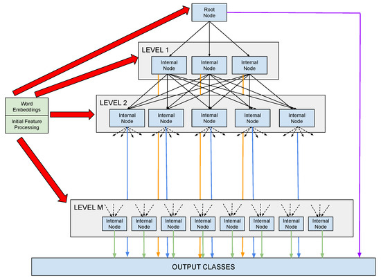 - Internal node: A DNN basic block whose inputs are word-embeddings-based and the classification result is obtained as the output of its parent node. In the same way, its output is connected in input to the corresponding children node;