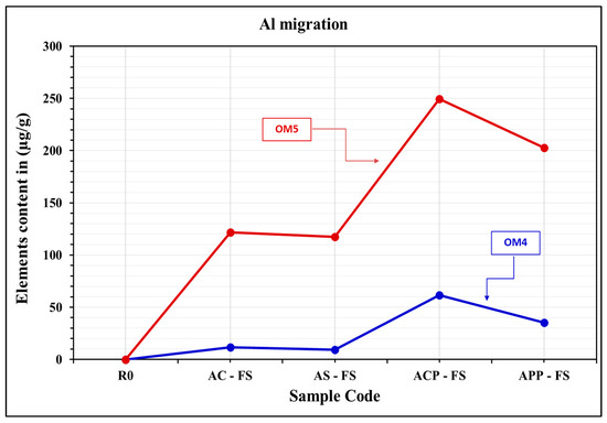 The elements that migrated to food simulants were analyzed using the ICP-MS technique. Food simulants were prepared following Regulation (EU) No 10/2011, where food simulant B, consisting of 3% (w/v) acetic acid, was prepared using the four types of aluminum pots. The tests applied to prepare food simulants are OM4 and OM5. OM4 represents the high-temperature application for all types of foods at temperatures up to 100 °C. Food simulants were subjected to 100 °C for 1 h for all types of aluminum pots used in this study. OM5 represents the high-temperature application for all types of foods, up to 121 °C, with food simulants subjected to 100 °C for 2 h for all types of aluminum pots used in this study. According to the standard, OM5 represents one of the worst-case conditions applied to all food simulants. The reference sample (R0) in Table 7 refers to the prepared food simulant as it is (water with 3% (w/v) acetic acid), without applying any cooking conditions. Table 7 presents the elements that migrated to food simulants from different types of aluminum pots under OM4 and OM5 test conditions. The values listed in Table 7 represent the averages of three trials conducted using the ICP-MS technique.