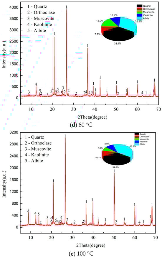 Figure 2 shows the analysis results of the physical composition of fine sandstone. The mineral components in this group of fine sandstone samples were quartz (Quartz, SiO2), orthoclase (KAlSi3Ox), muscovite (KAl2[AlSi3O10](OH)2), kaolinite (Kaolinite, Al2Si2O5(OH)4), and albite (Albite, NaAlSi3O8). When combined with the data from the X-ray diffraction pattern, the material composition of fine sandstone remains largely constant across a range of temperatures. In the temperature range of 18 °C~100 °C, the minerals in fine sandstone mainly change physically, with the proportion of quartz increasing from 32.6% to 34.6%, albite rising from 29.4% to 38.8%, orthoclase and muscovite fluctuating, and kaolinite rising from 12.3% to 8.9%. The free water in kaolinite and muscovite eventually leaks out as the temperature rises, and the friction between fine sandstone particles increases, which improves its macro-deformation resistance. At the same time, quartz grains will expand, promote the closure of primary cracks and pores inside them, and strengthen their macro-mechanical behavior. The appearance of thermal stress will make mineral grains dislocate, which will produce a stress field at the crack tip and increase the crack propagation power.