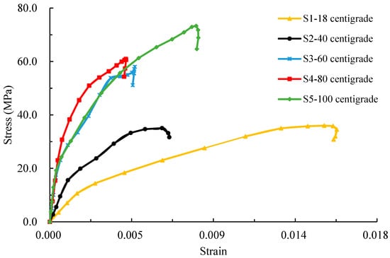 The testing temperature range for this group of fine sandstone was 18–100 °C, with an axial static load setting of 3.0 MPa. The preset bullet incidence velocity was 1.0 m/s, and the gas chamber pressure setting was 0.06 MPa. The density of fine sandstone was between 2.32 g/cm3 and 2.42 g/cm3, and the bullet incidence velocity during the experiment was 1.00 to 1.31 m/s [36]. Figure 3 characterizes the variation of fine sandstone’s dynamic stress and strain under seismic loading and different temperature conditions. Based on the macroscopic features of fine sandstone’s dynamic stress and strain response at various temperature conditions, the fine sandstone’s dynamic elastic modulus in the elastic section increased sharply from 7.4 GPa to 15.9 GPa. But, under the same temperature conditions, when the dynamic strain increased, the gradient of dynamic stress increase continuously decreased. At room temperature (18 °C) and 40 °C, the sample undergoes an initial compaction stage under dynamic loading. However, at temperatures of 60 °C, 80 °C, and 100 °C, the initial compaction stage of fine sandstone undergoes a shorter duration and rapidly enters the elastic deformation stage. From the macroscopic characteristics of fine sandstone’s dynamic stress and strain response under different temperature conditions, when the temperature is at 40 °C and 60 °C, there exists a plastic stress plateau section for dynamic stress (Figure 3 (S2, S3)). About 95% of the peak stress is represented by the stress value of the plastic plateau section. The stress plateau causes a “stress bimodal” pattern on the stress–strain curve, and stress rebound happens after the stress reaches its peak value.
