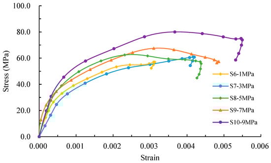 Figure 5 characterizes the fine sandstone’s dynamic stress and strain response under various seismic and axial static load scenarios. From the figure, it can be seen that under the condition that other influencing factors remain unchanged, an increase in axial static load will lead to an increasing trend in the fine sandstone’s dynamic stress. When the axial static load increases from 1.0 MPa to 9.0 MPa, the fine sandstone’s dynamic peak stress increases from 57.25 MPa to 80.01 MPa, with an increase in dynamic peak stress ranging from 0.87 to 6.17. During the compaction stage, the fine sandstone’s dynamic tangent elastic modulus is significantly higher than that of the linear elastic stage. From the dynamic stress and strain response of single sample, as the loading process progresses, the dynamic stress of fine sandstone exhibits two phenomena: (1) under low axial pressure conditions, the fine sandstone’s dynamic stress of increases to its peak value, leading to stress rebound (Figure 5 (S7)); (2) under high axial pressure conditions, the fine sandstone’s dynamic stress increases to its peak, then decreases, and then exhibits stress rebound (Figure 5 (S6, S8–S10)).