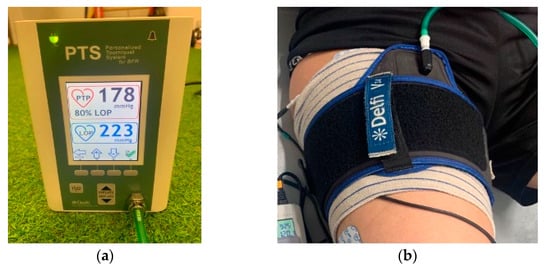 Group 2 (n = 10) received the same intervention, combined simultaneously with the BFR therapy protocol [34]. A PTS ii portable tourniquet system (Delphi Medical, Vancouver, BC, Canada), along with an Easy-Fit tourniquet cuff of a specific size corresponding to the patient’s thigh, was used. The total limb occlusion pressure (LOP) was achieved using the Delphi PTS system [35]. As is recommended to achieve muscle benefits, LOP was inflated to 80% of the maximum tolerated pressure (50–300 mmHg) [36]. The cuff width was selected based on limb size and was personalized for each player [36] (Figure 2). This individualized approach avoided excessive pressure in participants with lower LOP. Moreover, this system allowed for the precise control of cuff pressure throughout the training, even when natural changes in muscle volume occurred.