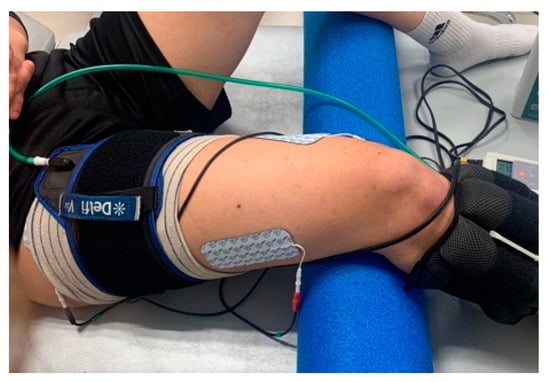 In this context, there has been a growing interest in analyzing the effects of combining BFR with other muscle strength training methods, such as neuromuscular electrical stimulation (NMES) [8,9]. This electrotherapeutic procedure consists of the ability to recruit motor units through motoneuron depolarization, resulting in the electrical excitation of muscle fibers [18,19]. Isolated NMES has traditionally been used as a reliable and safe technique to improve performance in healthy athletes [13,14] and to prevent muscle atrophy during periods of immobilization in injured football players [20,21]. However, there are no studies that evaluate the acute effects on muscle strength and volume when combined with BFR in women. Most studies aiming to increase strength in healthy subjects apply an occlusion rate of 80% in the BFR [15,16]. Nevertheless, when this percentage is combined with NMES, strength losses attributable to muscle fatigue have been observed [22]. Consequently, the hypothesis of this study suggests that the combined application of these techniques in female amateur footballers could induce immediate changes in strength.