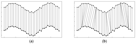 Two different alignments: (a) one-to-one alignment (Euclidean distance) and (b) one-to-many alignment (DTW algorithm).