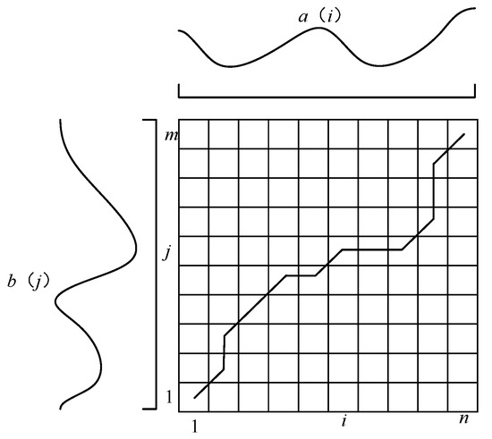 This method can be visualized as finding a path through grid points on a grid diagram (Figure 2), with the aligned points representing those visited on this path. We define this path as a warping path denoted by , and the regularized path can be considered as a collection of index sequences [16]: