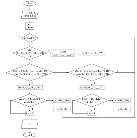 A complete pulsation cycle data segment was selected from the original pressure pulsation signal as a matching template for . Subsequently, this template was used to segment the overall signal data and create a dataset. A flowchart of the algorithm is presented in Figure 4. The objective is to identify the segment within the original signal, denoted as , that exhibits the highest similarity to the template . To achieve this, the DTW algorithm was employed to calculate the similarity between the template and the signal, starting from a designated position, . Throughout this process, the algorithm adhered to specific criteria, including a predefined similarity threshold , minimum allowable output length , and maximum allowable output length . The algorithm iteratively adjusts the starting position based on the computed similarity. Ultimately, the output consists of a set of start and end points that define the waveform segment [14].