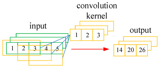 The convolutional kernel serves as the central component of the convolution layer, performing a sliding convolution operation on the input data with a step size of 1, as shown in Figure 5. This allows for weight sharing, feature extraction, and improved computational speeds. The formula for one-dimensional convolution is as follows [13]: