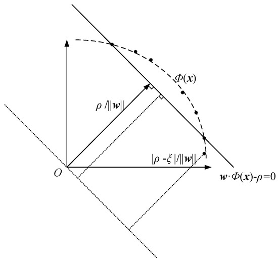 With the evolution of support vector machines, two distinct algorithms have emerged: the support vector data description (SVDD) algorithm, often referred to as the hypersphere method, and the one-class support vector machine (OCSVM) algorithm, commonly known as the hyperplane method. The underlying principle of the OCSVM algorithm is as follows [17]: a hyperplane is found in a higher-dimensional space to perform the linear separation of the original data samples mapped in this space. This process involves the initial establishment of a hyperplane and the subsequent maximization of the distance between the target data sample and the origin. This approach determines the optimal hyperplane, as shown in Figure 7.