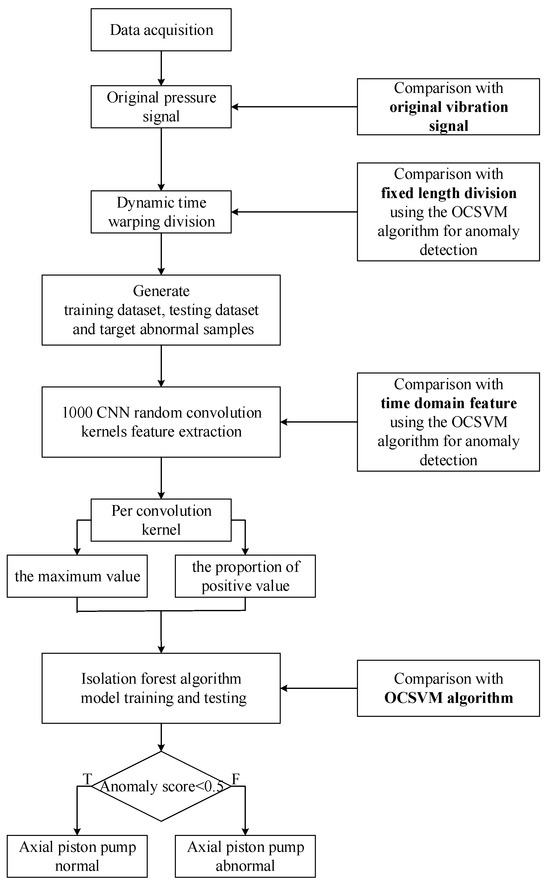 The process of axial piston pump anomaly detection is illustrated in Figure 10. First, the axial piston pump outlet pressure signal and end cap vibration signal were collected. Second, the collected original pressure signal was divided using the DTW algorithm to generate the dataset. Then, 1000 CNN random convolution kernels were used to carry out feature extraction from the divided data, and each convolution kernel was extracted to the maximum value and the proportion of the positive values of the two feature values. A total of 2000 features were extracted from 1000 random convolution kernels, and anomaly detection using the isolation forest algorithm was carried out.