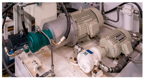 In this study, simulation tests were conducted to detect anomalies in axial piston pumps using a specialized testbed designed for axial piston pump failure simulations, as illustrated in Figure 11. The test bed was equipped with a pressure sensor positioned at the outlet of the axial piston pump to record pressure signals. Additionally, three vibration acceleration sensors were strategically placed in mutually perpendicular directions (x, y, and z) on the end cover and casing of the axial piston pump to capture vibration signals. Simultaneously, the LabView 2021 software facilitated the monitoring of the operational state of the axial piston pump, enabling the collection of experimental data. A schematic of the experimental setup is shown in Figure 12.