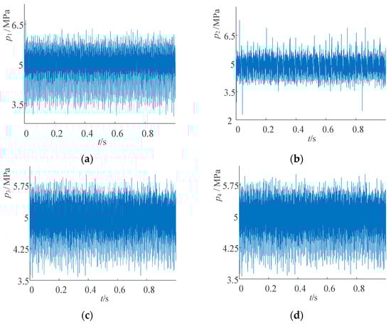 Time domain waveform plot of the raw pressure signal: (a) normal; (b) swashplate wear; (c) sliding shoe wear; (d) single-plunger loose shoe.