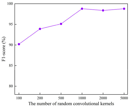 We investigated the effect of the number of random convolutional kernels (100, 200, 500, 1000, 2000, and 5000) on the overall performance of the proposed method. Figure 15 illustrates the model performance for different random convolutional kernel numbers. It can be observed that increasing the number of kernels effectively enhanced the model performance as long as the number remained below 1000. The model achieved optimal performance when the number of kernels reached 1000, demonstrating high classification accuracy. However, as the number of kernels continued to increase to beyond 1000, the variation in the model performance became relatively small. Therefore, we selected 1000 as the number of random convolutional kernels for this method. These results validate the sensitivity of the proposed method, which is essential for practical applications.