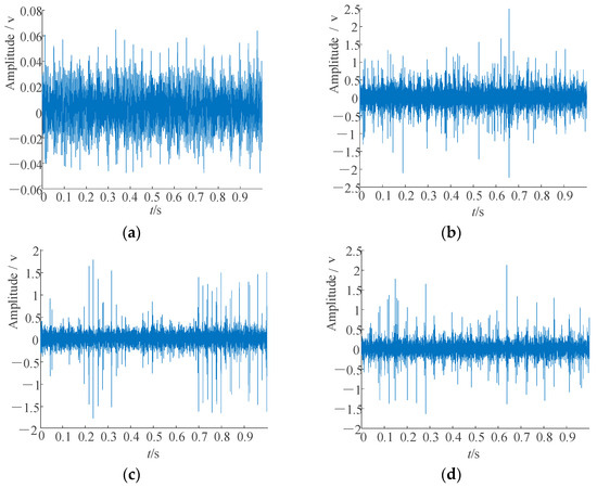 Time domain waveform plot of raw vibration signals: (a) normal; (b) swashplate wear; (c) sliding shoe wear; (d) single-plunger loose shoe.