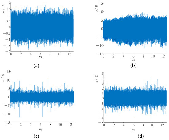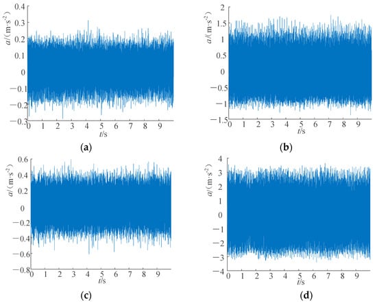 To further validate the relative stability of the pressure signals compared to the vibration signals, a comparison was made with the vibration acceleration signals collected using a vibration accelerometer on the end cap of the axial piston pump. For the three channels of vibration signals collected, it was observed that using the z-direction vibration data yielded better results in the analysis of the signals under abnormal conditions. Figure 16 shows the time domain waveforms of the original vibration signals obtained from the axial piston pump under four distinct working conditions.