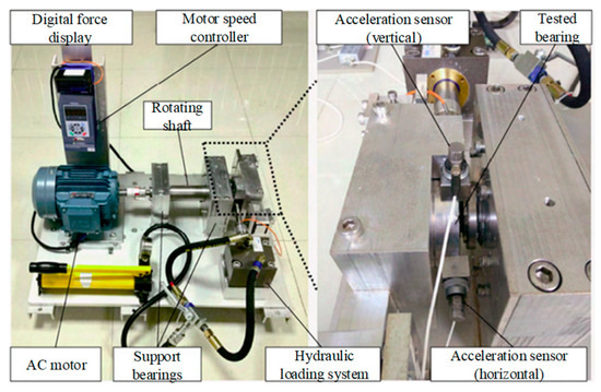 This experiment used a vibration dataset from the rolling–bearing accelerated life test platform XJTU-SY at Xi’an Jiaotong University [19], as shown in Figure 19. The bearing model used was the LDKUER204. Two unidirectional acceleration sensors were installed in the horizontal and vertical directions to capture bearing vibration signals. The sampling frequency was set to 25.6 kHz, with each sampling lasting 1.28 s. The sampling interval was set to 1 min. The experiment was terminated when the amplitude of the vibration acceleration exceeded 10 times the maximum amplitude of the healthy stage. The corresponding degradation data were recorded. In total, data were collected from 15 bearings, including five bearings for each of the three operating conditions. The vibration data in the horizontal direction of the bearing were observed at a speed of 2250 rpm and a radial force of 11 kN. These datapoints included data from the 464th to the 473rd set for the inner ring fault in bearing 2_1, the 59th to the 68th set for the outer ring fault in bearing 2_2, the 138th to the 147th set for the cage fault in bearing 2_3, and the 21st to the 30th set for normal operation in bearing 2_1. The time domain waveforms of the original signals under four operating conditions are shown in Figure 20.