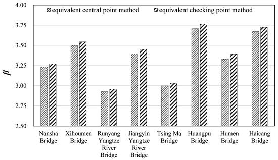 Comparison of the reliability indices calculated using the equivalent central point method and equivalent checking point method for eight existing bridges.