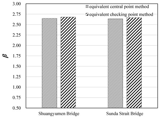 Figure 1 shows the comparison of the reliability indices calculated using the equivalent central point method and equivalent checking point method. It can be seen from the figure that the relative calculation errors of the reliability index calculated using the equivalent central point method and equivalent checking point method were between 1.06% and 1.87%. The equivalent central point method could be adopted for the purpose of simplified calculations.