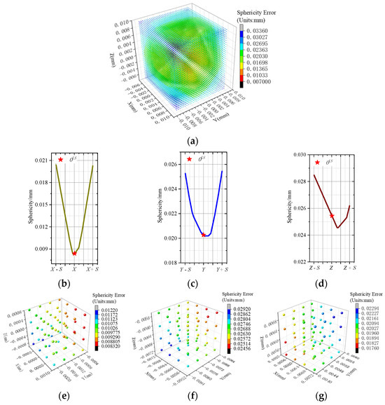 Schematic representation of spherical error distribution characteristics. (a) Spherical error distribution of sampling points in the global space; (b) change in sphericity along the X-axis; (c) change in sphericity along the Y-axis; (d) change in sphericity along the Z-axis; (e) schematic distribution of sampling points in Local Space A; (f) schematic distribution of sampling points in Local Space B; (g) schematic distribution of sampling points in Local Space C.