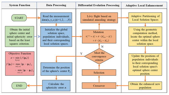 Subsequently, the integration of the computational geometry method employed with the DE algorithm is performed. We establish the positions of local solution spaces by utilizing the individuals that are present in the population of differential evolution. During each iteration, the sizes of the local solution spaces are adaptively adjusted based on the distances between the individuals in the population and the global optimum. Additionally, incorporating Lévy flights and simulated annealing techniques allows for the perturbation of the positions of individuals within the population, thereby augmenting the diversity of local solution spaces. After attaining high-precision solutions within the designated local spaces, the DE algorithm individuals are relocated to their respective optimal positions within these local solution spaces. With each successive iteration of the DE algorithm, the population progressively approaches convergence towards the global optimum. As a result, an optimal solution for minimizing the sphericity error is eventually obtained. The overall algorithmic process is depicted in Figure 3. We denote the computational geometric method integrated with the DE algorithm as “Adaptive Local Enhancement”. The detailed steps of this approach are outlined in Section 3.2.