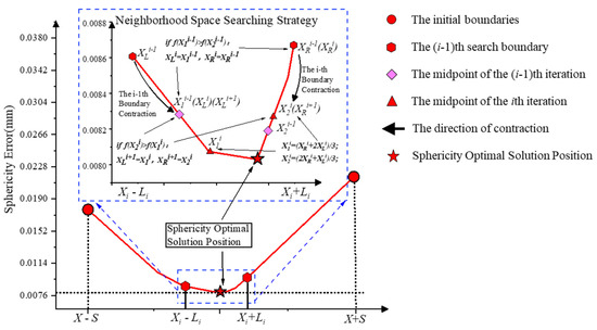 Furthermore, for the one-dimensional search area corresponding to on the plane in Figure 5, the detailed search process is illustrated in Figure 6. The middle points, and , are determined based on the neighborhood searching range of the individuals, , after which the magnitudes of and are compared. If , then set ; otherwise, set . Through the strategy above, used to shrink the search interval, the optimal solution is considered as the sphericity error at the position when is satisfied.