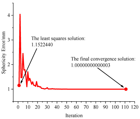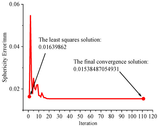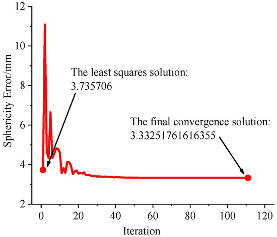 According to the standards set by the American Society of Mechanical Engineers (ASME) and the International Organization for Standardization (ISO) [6,7], the processing of datasets can be executed by applying four distinct criteria: the least squares criterion, the minimum circumscribed criterion, the maximum inscribed criterion, and the minimum zone criterion. The minimum zone criterion is the general default criterion for evaluating the sphericity error [8,9,10]. The aforementioned criterion enables the acquisition of a unique minimum sphericity error, and it is also the arbitration method when there is inconsistency in the evaluation of the sphericity error. The minimum zone criterion is an unconstrained and non-differentiable optimization problem, which poses significant challenges in terms of finding a viable solution [11,12,13].