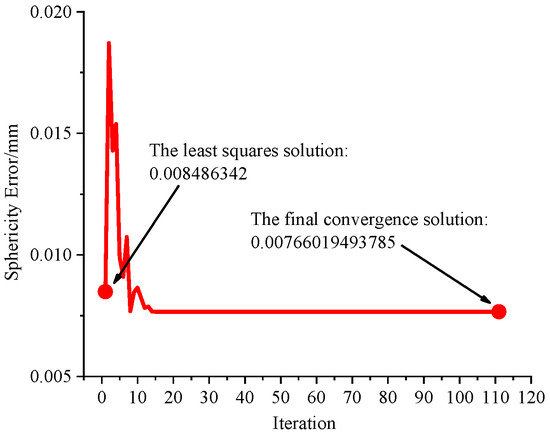 The high-precision sphere constitutes a pivotal component within the realm of precision instruments. A sphere’s primary form tolerance characteristic manifests as a sphericity error. This inherent sphericity error, in turn, introduces unwelcome vibrations and noise, directly exerting a tangible influence on these precision instruments’ precision and service longevity [1,2]. The measurement and evaluation of the sphericity error are primarily conducted using three-coordinate measuring machines (CMMs) [3,4]. This advanced technology enables the acquisition of extensive contour data for the spheres under examination, which are then meticulously stored in the XYZ coordinate format, forming a substantial dataset [5]. It is crucial to underscore that this dataset’s precise and efficient processing stands as a critical imperative for the accurate evaluation of the sphericity error in spherical objects.