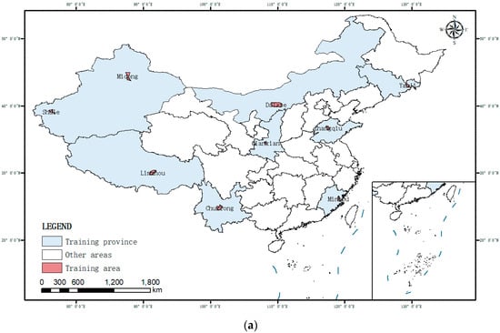 Buildings are closely related to their geographical environment, and regionality is one of the inherent attributes of architecture [28]. When building homes, people often use abundant local materials and technical traditions to construct buildings adapted to the local climate; thus, different regions have formed unique regional architectural cultures [29]. With the industrialization and standardization of the construction industry, the regional features of urban buildings have gradually weakened, while the regionality of rural buildings is still pronounced in many areas, resulting in high heterogeneity among rural buildings [30]. Considering the vast territory and complex diverse landforms in China, as well as the dilemma of insufficient samples and large differences in rural building extraction, this study selected nine typical geographical regions, including the Northeast Plain (Yanji), North China Plain (Zhangqiu), and Loess Plateau (Qian County), to construct a rural building image dataset to cover the main geomorphological types, climate characteristics and regional architectural styles in China with strong typicality and representativeness [31]. Figure 1 presents an overview of the study area.