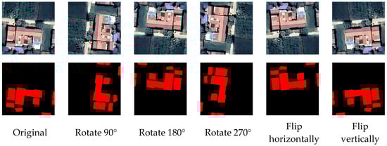 Building extraction based on deep learning is a computer vision semantic segmentation task, that is, dividing real objects into buildings and non-buildings [32]. We obtained Google remote sensing images of some rural areas in the above research areas in 2020 with a resolution of 0.29 m from Google Earth and used the open-source LabelMe software version 5.2.1 based on PyQt for image annotation (buildings in red, non-buildings in black) to generate annotated images corresponding to the original images [33]. To adapt to the training process of deep learning, each village orthophoto was uniformly cropped into 256 × 256 pixels to generate cropped images. Data augmentation methods can effectively improve the generalization capability of models and solve overfitting problems [34]. Therefore, this study adopts data augmentation methods to expand rural building sample data. The main methods include applying clockwise rotation of 90 degrees, 180 degrees, 270 degrees, horizontal flipping and vertical flipping to the cropped images obtained in the previous step to generate augmented images after data enhancement. The enhanced dataset contains a total of 13,428 images and annotations, of which 10,742 were randomly selected for model training and 2686 for testing. Figure 2 shows a set of original images, annotated images and augmented images after data enhancement.