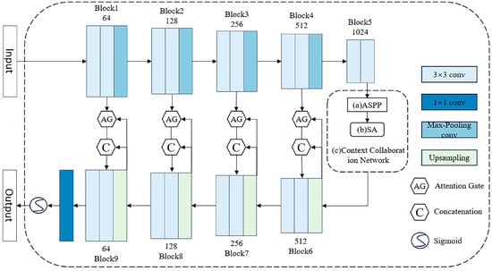 (2) AGs-UNet is an improved version of UNet with multiple AG modules embedded to achieve enhanced representation of building-related features [21]. Its attention mechanism can suppress irrelevant features, thereby improving the model’s ability to identify key building areas [49]. AGs-UNet has verified the improvement of extraction performance on multiple high-resolution urban remote sensing image datasets and is selected to evaluate the effect of the attention module on this task.