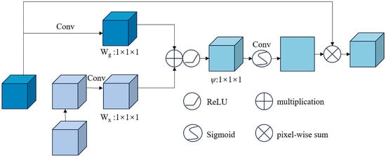 For the building extraction task from high-resolution remote sensing images, the attention gate (AG), as a spatial attention mechanism, enables the model to selectively focus on different spatial regions of the image to accurately extract building contours in remote sensing images, which can significantly improve segmentation model performance [40]. AG contains two branches for different feature processing. These two branches are fused at the pixel level, which can better integrate the multidimensional information of the input image. AG uses two different activation functions: ReLU for feature normalization and Sigmoid for generating attention coefficients. The combination of these two activation functions introduces nonlinearity to AG. Second, AG contains three sets of trainable parameters that control the gate coefficients Wg, attention coefficients Wx, and output adjustment parameters, making AG more adaptable to specific segmentation tasks. Additionally, its behavior can be controlled by adjusting the parameters. AG is an efficient, controllable and scalable spatial attention mechanism that is well-suited for fine-grained building segmentation tasks from high-resolution remote sensing images. It improves the model’s ability to identify key target areas by dual-branch feature fusion, adjustable parameters, and suppressing irrelevant regions. Integrating AG into standard convolutional networks can significantly improve the extraction accuracy of small and densely distributed buildings [41]. The AG module structure is illustrated in Figure 4.