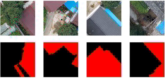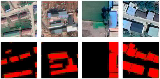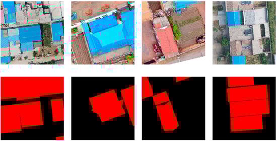 This dataset uses UAV images obtained by DJI Inspire2 with a spatial resolution of up to 0.1 m, clearly capturing building boundary features and providing delicate visual information to meet the requirements of deep learning for high-quality image samples. It covers sample images from provinces, including Shaanxi, Jiangsu and Sichuan, with extensive geographical distributions. The images cover common rural building types in China, including masonry, stone and brick, with strong representativeness [45]. The dataset contains 6060 original images and annotated samples, 4848 of which were selected for model training and 1212 for testing. An example of an input image and its corresponding label are presented in Figure 7. The dataset has been made public, and the data service system website is https://www.scidb.cn/en/detail?dataSetId=807518619180204032&version=V1 (accessed on 8 May 2023).