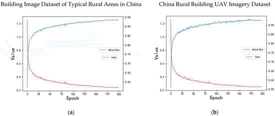 The model training and testing in this study are based on the PyTorch deep learning framework and use open-source image processing modules, including TorchVision, Skimage and Matplotlib. To accelerate the calculation, the computing device used in this study is the NVIDIA GeForce GTX 3090 graphics processing unit, with a memory capacity of 24 GB, and CUDA 11.0 has been installed for GPU acceleration. Considering the constraint of GPU memory resources, all image samples are randomly cropped to 256 × 256 pixels to meet the memory requirements for model training and cross-validation in each round. In the hyper-parameter configuration of the model, we performed multiple comparative experiments to determine the optimal settings for each model. The Adam optimization algorithm [51] is used for model training, with an initial learning rate set to 0.0001. To suppress overfitting, L2 regularization is introduced in all convolutional layers, and the weight decay coefficient [52] is set to 0.0001. Additionally, considering the limitation of the GPU memory of the computing device, the training of each model takes batches of 18 images as input and iterates 200 epochs on each dataset. To ensure the fairness of comparative experiments between different models, all comparison models are trained under the same software and hardware environment. The training accuracy and loss profiles [53] of the proposed AGSC-Net architecture on both datasets are presented in Figure 9. As shown, the model accuracy consistently improves over training iterations and eventually converges to approximately 0.94 with minor fluctuations. Concurrently, the loss monotonically decreases and reaches a plateau, indicating effective optimization of the AGSC-Net model. Unless otherwise specified, all comparative models were trained under the same hardware and software configuration detailed previously to enable fair benchmarking against the proposed AGSC-Net.