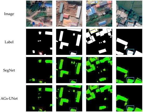 To evaluate our rural building extraction method, we selected the typical encoder–decoder architecture extraction model SegNet, AGs-UNet with a structure similar to our building extraction model, C3Net, and CSA-UNet, also applied to rural building extraction for comparative experiments. A brief introduction of these models is as follows: