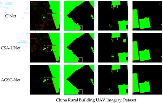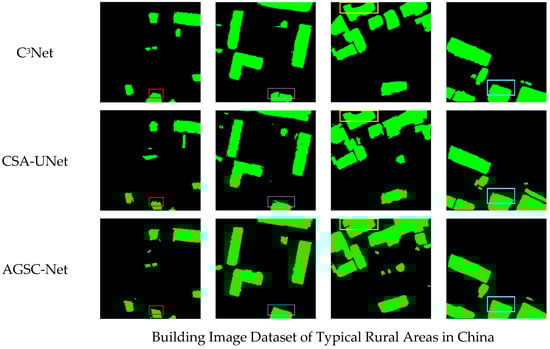 To validate the superiority of our self-constructed datasets for rural building extraction model training, we will train and test the proposed model on the self-constructed Building Image Dataset of Typical Rural Areas in China and the open China Rural Building UAV Image Dataset respectively. Test data from four geographic regions with distinct characteristics were selected from each dataset to assess the proposed model’s building extraction capabilities. Representative sample images were chosen from each image set for qualitative analysis. The proposed rural building extraction network AGSC-Net was compared to models such as SegNet, AGs-UNet, C3Net and CSA-UNet. As shown in Figure 10 and Figure 11, the original remote sensing images and corresponding ground truths occupy the first two rows, while rows 3–7 exhibit the building extraction outputs of the different models. The green and black pixels in the extraction results denote regions classified by the models as buildings and non-buildings, respectively.