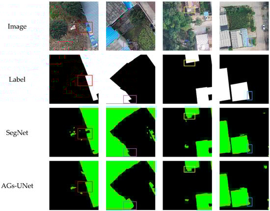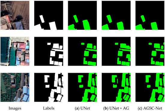 The following three ablation experiments are set up: (a) only containing the U-shaped convolutional neural network (UNet) architecture, (b) an improved network (UNet + AG) with AG modules based on UNet, and (c) the complete model (AGSC-Net) with both AG and context collaboration (CC-Net) modules. Under the same computer software and hardware environment and hyperparameter settings, the above three models were trained for 200 epochs. After training, we selected the same images from the validation set of the Building Image Dataset of Typical Rural Areas in China for model effect verification to ensure fair comparison under the same conditions for each experiment.