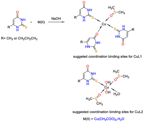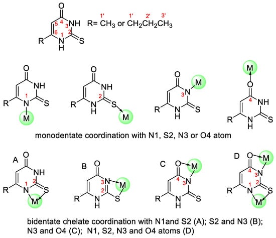 In Scheme 1 (top), the chemical structures of 6-methyl-2-thiouracil and 6-propyl-2-thiouracil are shown. Various metal complexes exhibit a monodentate coordination mode with 2-thiouracil derivatives, binding through different atoms, such as N1 (e.g., Cu(I) complex) [27], N3 (e.g., Pd(II) complex) [28], S (e.g., Ru(II), Cu(I), Sn(IV), Pt(II), and Pd(II) complexes) [11,14,23,29], or O (e.g., Co(II), Ni(II), Mn(II), and Zn(II) complexes) [30,31,32].