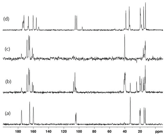 The 13C spectrum of PdL2 obtained by cross-polarization (Figure 4d) showed unexpected results. There were multiple signals for each type of carbon atom in the ligand, indicating the presence of more than one palladium complex or a palladium complex with two ligands in the coordination sphere simultaneously.